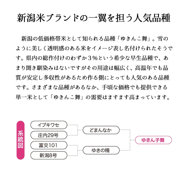 新潟の低価格帯米として知られる品種「ゆきん子舞」。雪のように美しく透明感のある米をイメージ表し名付けられたそうです。県内の総作付けのわずか3%という希少な早生品種で、あまり聞き馴染みはないですがその用途は幅広く、高温年でも品質が安定し多収性があるため作る側にとっても人気のある品種です。さまざまな品種があるなか、手頃な価格でも提供できる単一米として「ゆきん子舞」の需要はますます高まっています。