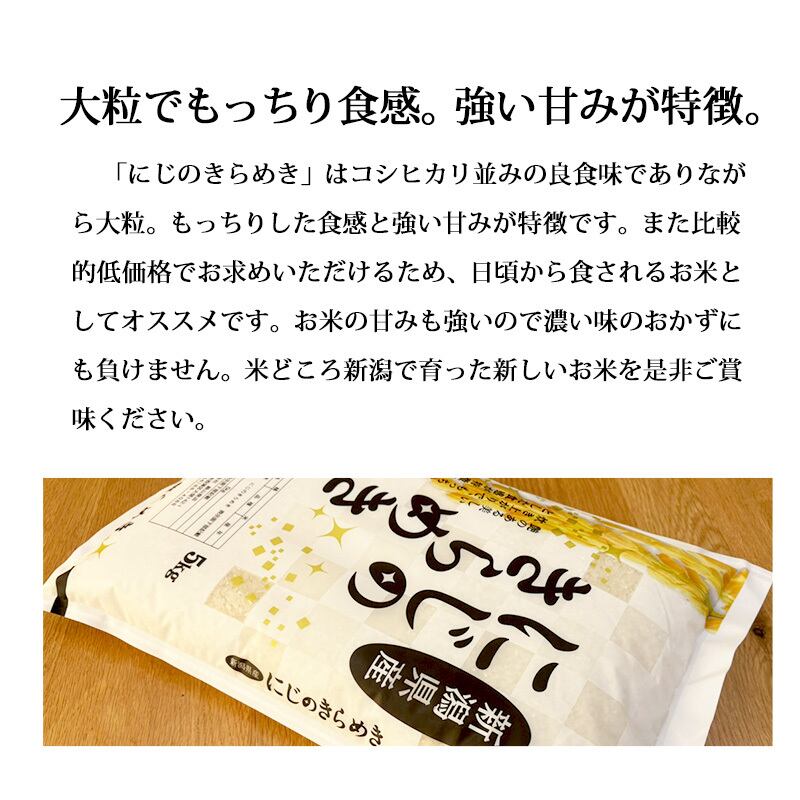 「にじのきらめき」はコシヒカリ並みの良食味でありながら大粒。もっちりした食感と強い甘みが特徴です。また比較的低価格でお求めいただけるため、日頃から食されるお米としてオススメです。
