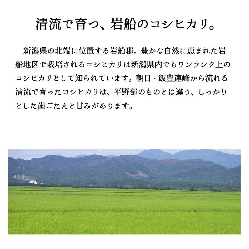 新潟県産コシヒカリの3大産地、魚沼産コシヒカリ、佐渡産コシヒカリ、そして「岩船産コシヒカリ」。良食味で知られる岩船地区限定のコシヒカリをお届けします。岩船地域(旧岩船郡と村上市)は、新潟県の最北部に位置し、朝日連峰から流れる豊富で清冽な水を利用した稲作が、古くから行われておりました。